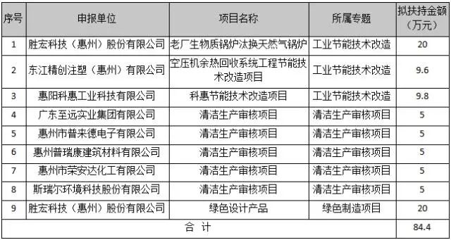 据公示附件“2021年惠阳区节能专项资金项目拟安排表”内容,获得嘉奖的项目共有三个专题类别,分别为:工业节能技术改造、清洁生产审核项目和绿色制造项目,分别有3项目、5项目和1项目。其中NG娱乐科技(惠州)股份有限公司的老厂生物质锅炉汰换天然气锅炉,东江精创注塑(惠州)有限公司的空压机余热回收系统工程节能技术改造项目等3项目为工业节能技术改造;NG娱乐科技(惠州)股份有限公司的绿色设计产品为绿色制造项目;惠州普瑞康建筑材料有限公司、广东至远实业集团有限公司等5企业的清洁生产审核项目为清洁生产审核项目。