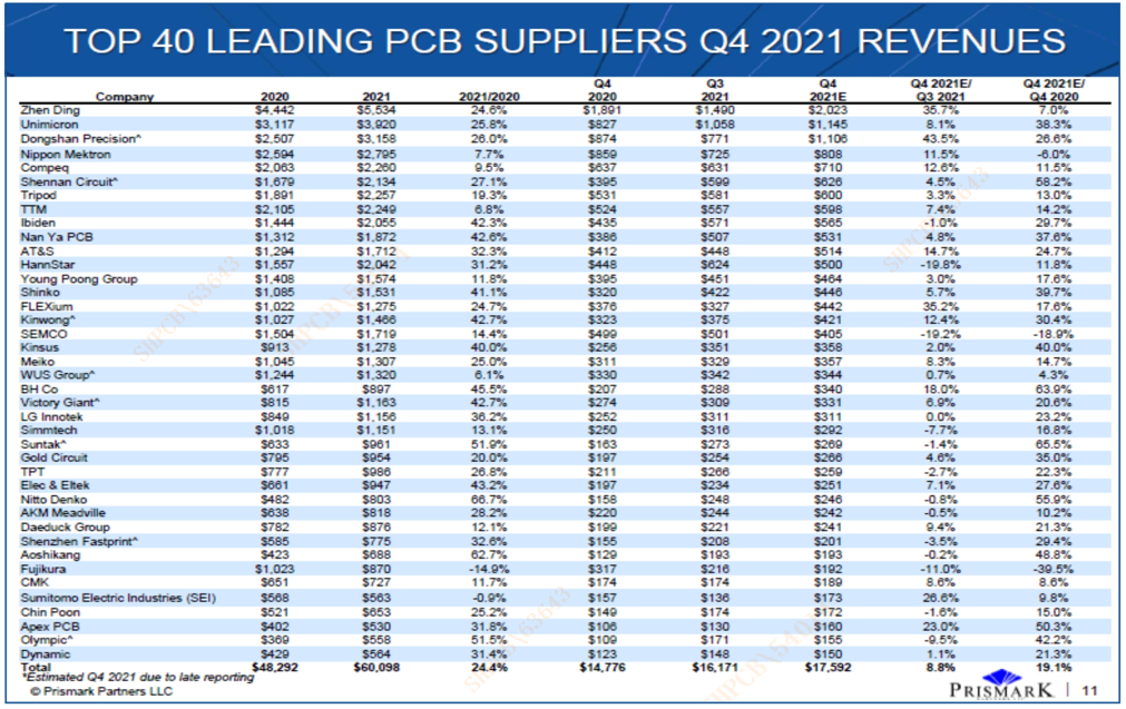 近期,国际知名电子行业咨询集团Prismark Partners发布2021年第四季度全球40强PCB企业排行榜与数据分析报告,共有七家内资企业上榜。其中,NG娱乐科技在2021年第四季度全球PCB企业四十强排行榜中位列第22名,在内资PCB企业中位列第4名。